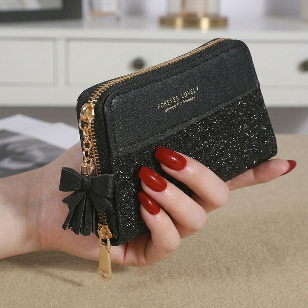 Forever Lovely Black Glitter Wristlet Wallet - Luxury Slim Zip-Around Clutch for Women. This elegant long wallet features a unique dual-texture design, combining a smooth matte black upper with a high-shine black glitter base.